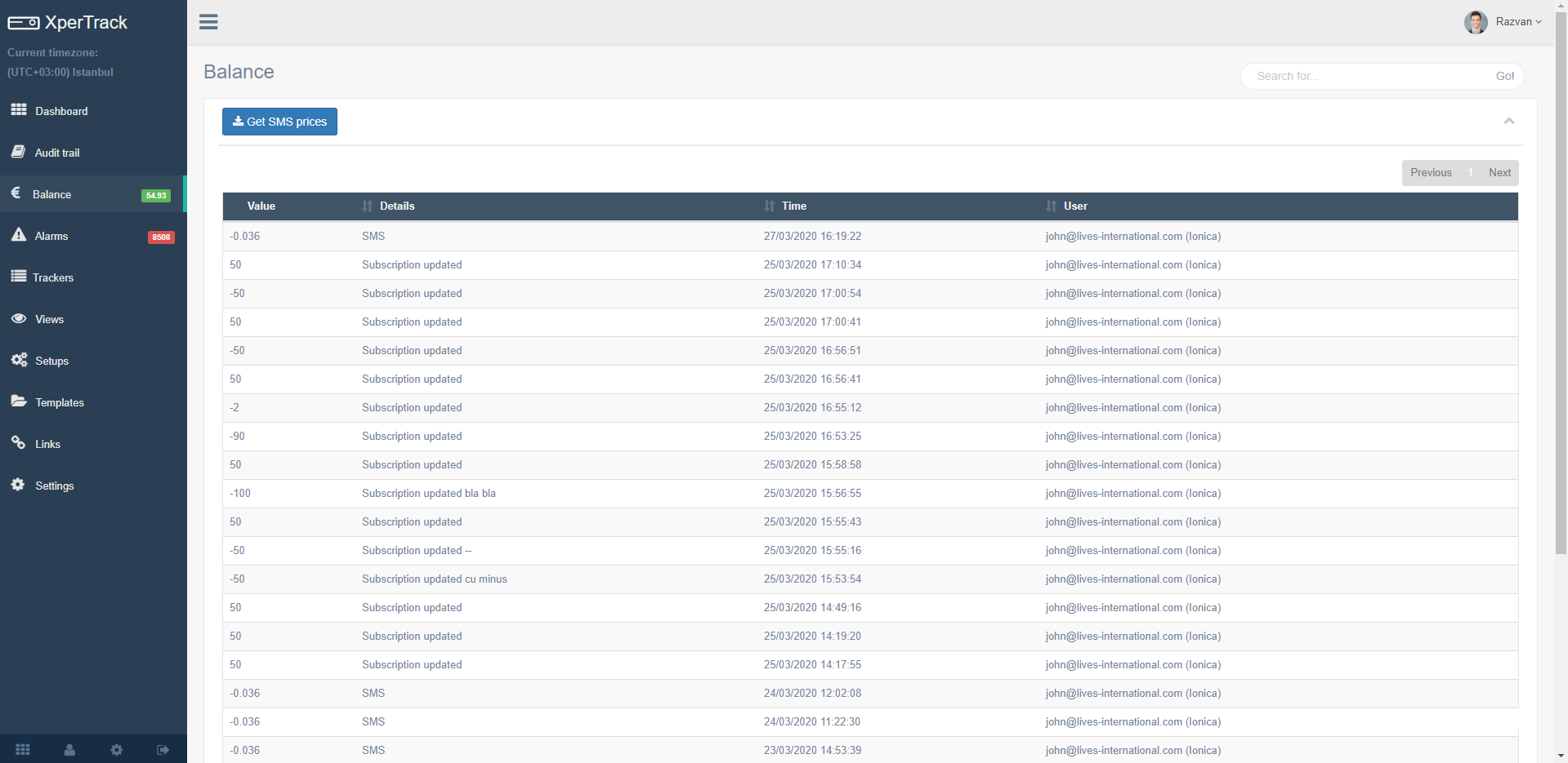 In Balance all the transactions will be recorded: sent text message, subscription updates for trackers which brings extra credit.