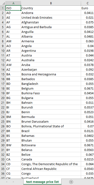 Press on button to get the list of sms price worldwide.